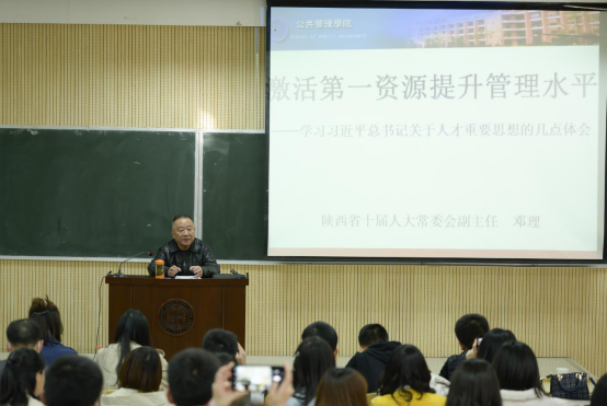 2020年11月6日下午在西北大学太白校区7111教室,西北大学565net必赢邀请到了陕西省人大十届常委会副主任、省决策咨询委员会副主任邓理同志,他为我院MPA师生带来题为“激活第一资源、提升管理水平——学习习近平总书记关于人才重要思想的几点体会”的专题讲座。本次讲座是565net必赢20周年院庆系列活动之一,也是西北大学MPA名家论坛系列之一。讲座由雷晓康院长主持,王尧宇副校长致辞,565net必赢部分教师和2020级全体MPA学生参加。
