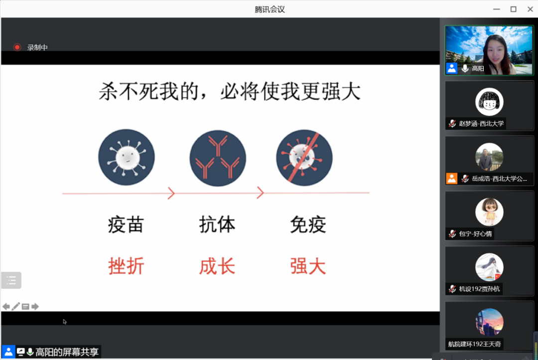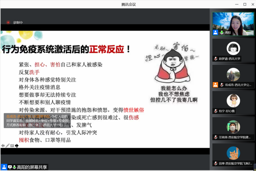 高阳老师从疫情下的应激反应为切入点,描述了人们在疫情时期常出现的行为表现,具体表现为对他人身份、外貌、行为、观点等的过分苛责,这些往往会引起个体情绪的变化。她指出,这些都是个体行为免疫系统激活后的正常反应,同学们无须对此感到焦虑不安。