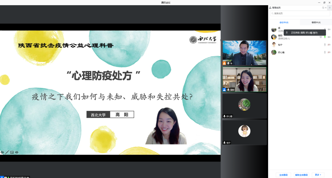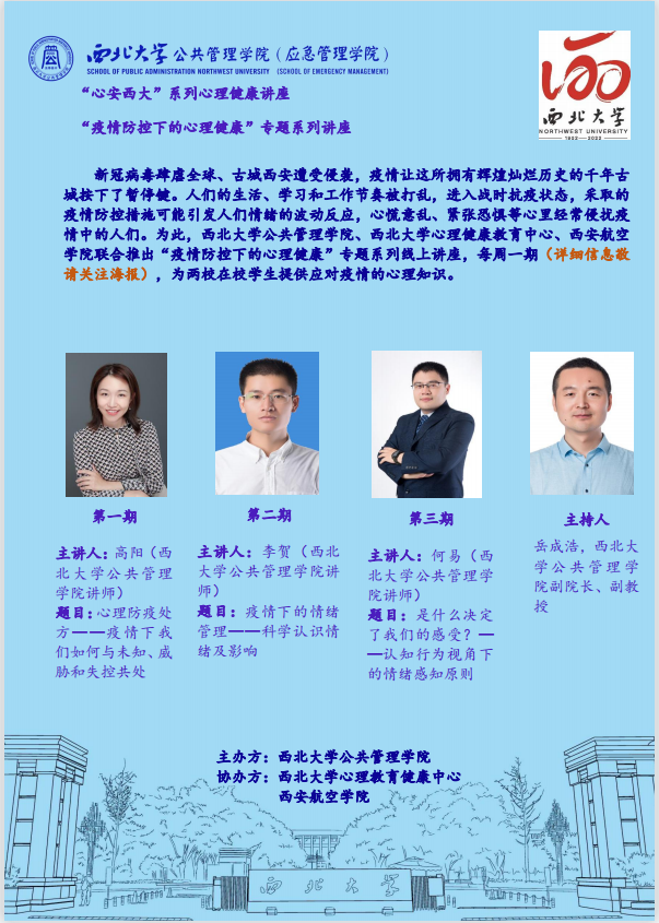 新冠病毒肆虐全球、古城西安遭受侵袭,疫情让这所拥有辉煌灿烂历史的千年古城按下了暂停键。人们的学习、生活和工作节奏被打乱,进入战时抗疫状态,采取的疫情防控措施可能引发人们情绪的波动,心慌意乱、紧张恐惧等心理经常侵扰疫情中的人们。为此,西北大学565net必赢联合西北大学心理健康教育中心、西安航空学院,并与省卫健委合作,及时策划推出“疫情防控下的心理健康”专题系列线上讲座,每周一期,共三期,均由我院熟悉心理学的青年才俊主讲,为身处疫情中的学生、老师和工作人员提供缓解压力、紧张和焦虑的心理知识和技巧。首期讲座便受到西北大学、西安航空学院师生和社会各界人士的热烈关注和赞赏,学院将继续秉持“公诚勤朴”的校训和“正学善行”的院训发挥自身特长,助力陕西科学抗击新冠疫情。