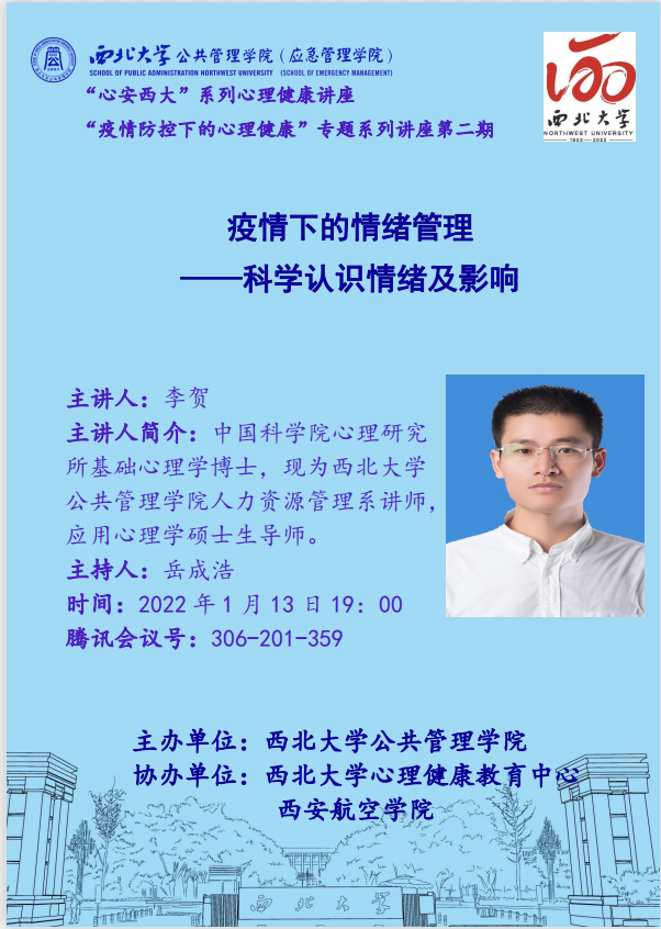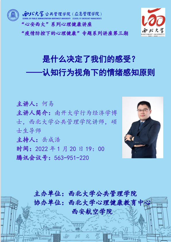 由省卫健委心理援助组、西北大学565net必赢、西北大学心理健康教育中心、西安航空学院联合推出“陕西抗疫:心理热线专家组公益讲座”、“疫情防控下的心理健康”专题系列线上讲座、“心安西大”心理健康系列讲座于2022年1月6日19点-20点30分顺利举办,6400多人在线观看(腾讯会议在线737人,省卫健委“好心情”平台转播在线近5700人)。本次讲座第一期题为:“心理防疫处方——疫情下我们如何与未知、威胁和失控共处”,由我院副院长岳成浩副教授主持,高阳讲师主讲。高阳老师是清华大学社会心理学博士,西北大学心理健康教育中心兼职心理咨询师,国家三级心理咨询师;主要从事危机决策、恐惧管理理论和身心健康机制等方面的研究。