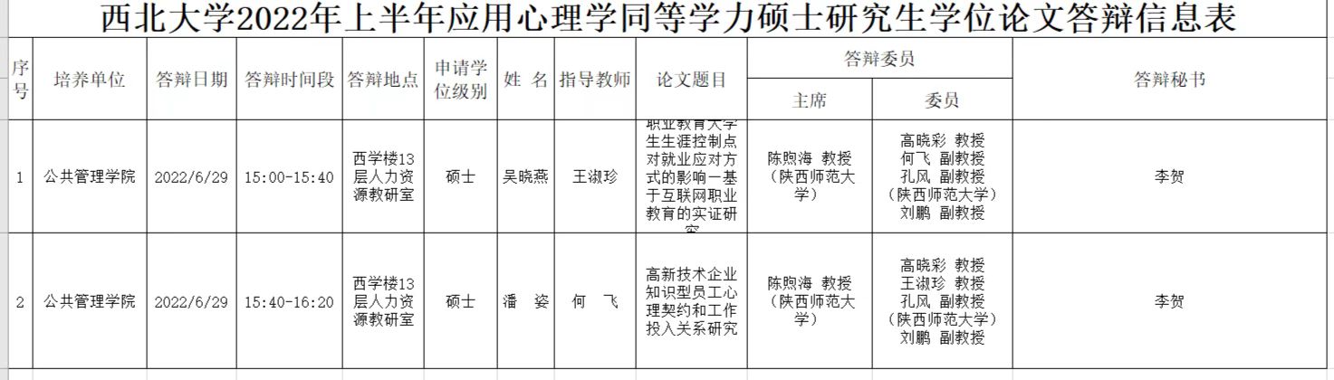 西北大学2022年上半年应用心理学同等学力硕士研究生学位论文答辩信息表