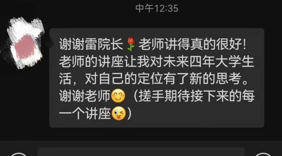 课后,雷院长给予新生以亲切寄语,同学们也与雷院长进行了积极互动。雷院长语言风趣,观点精妙,指点深刻,振奋人心,令同学们感触颇深。学生们坦言,雷院长的讲话极大地助力新生们快速适应大学的学习生活,帮助同学们找到了专业学习的正确方向,为学生们未来事业路线做出了指导和规范。