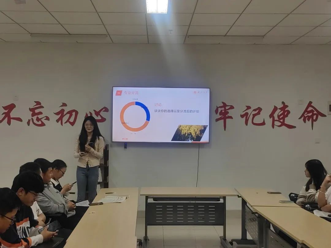 接下来,就专业分流的相关问题,班长带领大家分析了本班同学上学期期末考试情况以及专业分流情况,班级同学就如何选择以及对未来学习生活的规划进行了讨论。