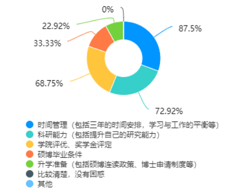 研一新生们对于研究生阶段的学术科研仍有很多自己的思考和困惑。绝大多数同学(87.5%)希望能够解决好时间管理方面的问题,其次是关于科研能力培养(72.92%)和评奖评优条件(68.75%)方面的问题,还有同学缺乏对学院毕业条件(33.33%)、升学政策(22.92%)的了解,希望得到相应制度内容的解读。对此,我们已于本周内顺利举办本学年正学恳谈会,邀请学校学院领导与各专业老师对同学们的困惑分别做以解答,后续将通过举办各类等活动,尽力解决大家遗存的问题,为同学们做好服务。