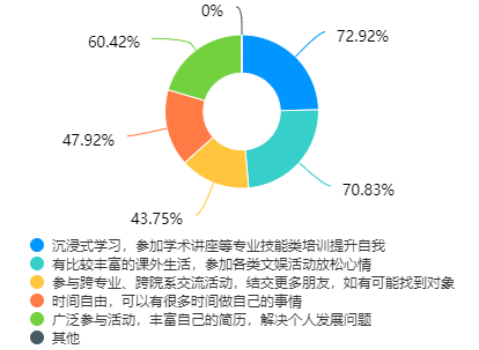 从问卷结果统计数据来看,超半数的研一新生希望在研究生阶段能够兼顾科研学习(72.92%)和课外生活(70.83%),有47.92%的同学希望可以更多有时间做自己的事情,而有43.75%的同学希望结交更多朋友。这说明新生同学们对自己的研究生生活有比较清晰的认知,在研究生期间保持科研学习与个人生活的平衡状态已成为我院研一新生的共识。