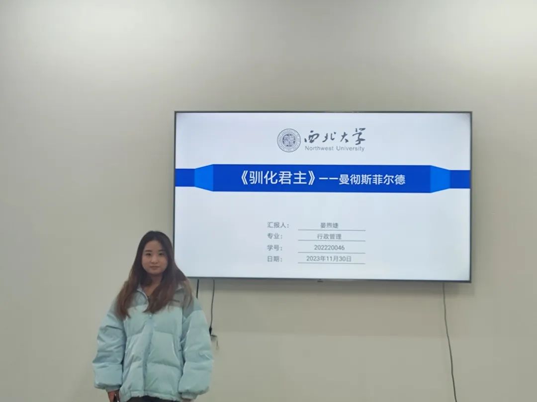 2022级行政管理专业硕士研究生晏煦婕分享的书籍是哈维·曼斯菲尔德的《驯化君主》,她围绕本书简介、内容梳理、收获感悟三个方面展开分享。她首先阐述了作者的观点——执行权具有暧昧性。接下来,她梳理了执行权的史前史、执行权的发现和执行权的宪政化三个演变发展阶段。最后,她分享了从阅读本书的过程中得到的启示与反思:“没有哪一个领袖能够超过权力的羁绊”。