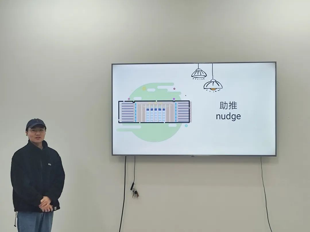 2022级应用心理学专业硕士研究生张浩燃分享了由理查德塞勒和桑斯坦所编写的书籍《助推》,他的汇报内容主要从助推是什么、为什么需要助推以及助推可以为我们做什么三个部分展开。他首先向大家介绍了“助推”的定义,并结合生活中常见的有关“助推”的例子帮助大家理解。随后,他对助推的核心原理基于人的认知双重加工模型进行阐释,说明了助推的目的是弥补人们思维的不足。最后,他分享了助推在我们现实生活中是如何进行的,并运用了默认选项以及框架效应两种助推的手段为大家生动地讲解。