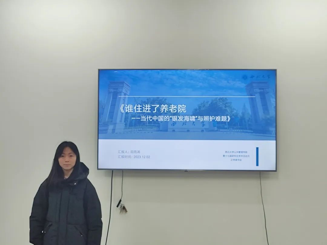 2022级社会保障专业硕士研究生田雨浠分享的书目是葛玫的《谁住进了养老院——当代中国的“银发海啸”与照护难题》,她的汇报围绕作者与作品简介、内容简介与作品看点以及阅读感悟三个方面展开。田雨浠同学首先从当代中国人口老龄化的现状出发,引出了本书的主要关切,即人口老龄化背景下的养老问题。紧接着,她针对本书的章节内容选择了一个具体案例来讨论家庭养老选择中的伦理问题。最后,在总结概述本书核心内容的基础上,她结合专业知识向大家分享了自己的读书感悟,并对自己在阅读过程中存在的问题进行了反思。