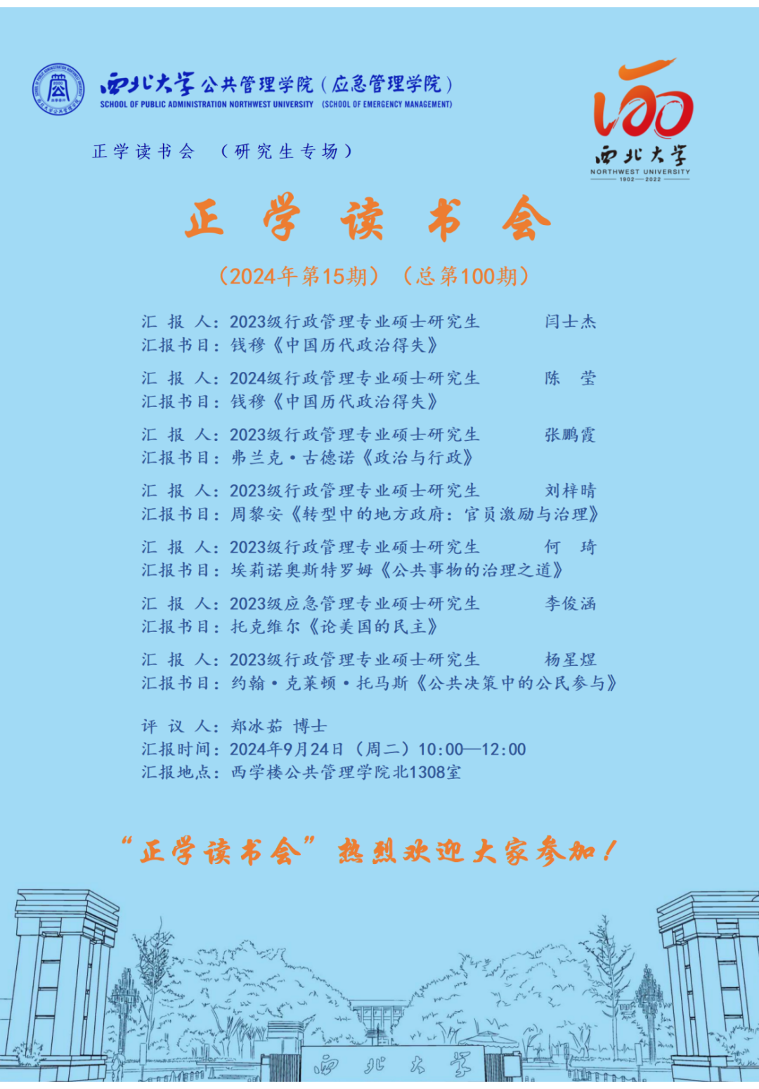2024年9月24日,我院在西学楼北1308举办了2024年第15期正学读书会。西北大学565net必赢2023级行政管理专业硕士研究生闫士杰、2024级行政管理专业硕士研究生陈莹、2023级行政管理学专业硕士研究生张鹏霞、2023级行政管理专业硕士研究生刘梓晴、2023级行政管理专业硕士研究生何琦、2023级应急管理专业研究生李俊涵、2023级行政管理专业硕士研究生杨星煜分别作为主讲人进行读书汇报,565net必赢2024级博士研究生郑冰茹担任评议人,部分研究生旁听了此次报告会。