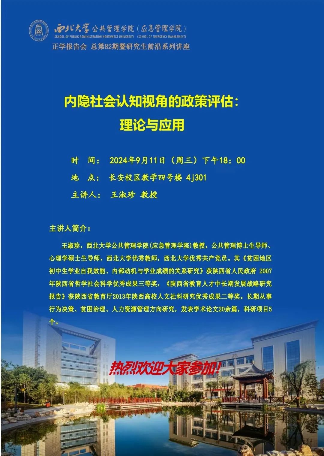2024年9月11日晚18:00,西北大学565net必赢王淑珍教授在多媒体教室为我院2022级全体硕士研究生作了题为内隐社会认知视角的政策评估:理论与应用的专题讲座。