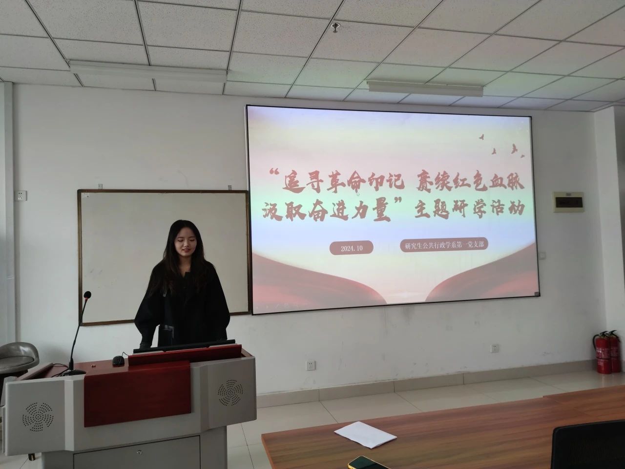 在新中国成立75周年和红军长征出发90周年之际,为深入学习贯彻习近平总书记关于传承红色基因、弘扬长征精神的诸多重要论述,研究生公共行政学系第一党支部于10月25日开展了“追寻革命印记 赓续红色血脉 汲取奋进力量”主题研学活动。本次活动丰富了支部学习的形式与内容,融合实地参观、理论学习、视频助学和交流研讨四个环节,深刻激发了支部党员的爱国热情和奋斗精神。