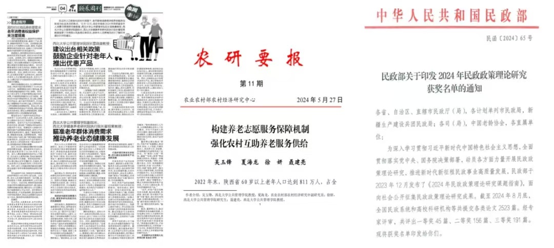 P2:《构建养老志愿服务保障体制 强化农村互助养老服务供给》于2024年5月被农业农村部内参《农研要报》刊登,并呈送农业农村部相关领导