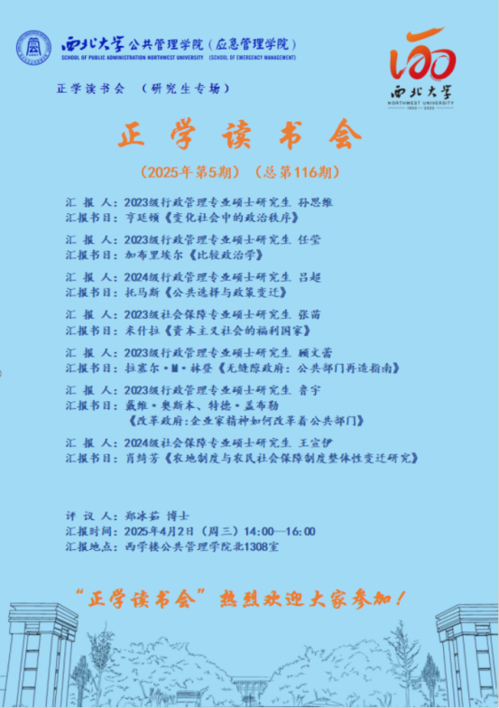 2025年4月2日,我院在西学楼北1308举办了2025年第5期正学读书会。西北大学565net必赢2023级行政管理专业硕士研究生孙思维、2023级行政管理专业硕士研究生任莹、2024级行政管理学专业硕士研究生吕超、2023级社会保障专业硕士研究生张苗、2023级行政管理专业硕士研究生顾文蕾、2023级行政管理专业硕士研究生鲁宇、2024级社会保障专业硕士研究生王宣伊分别作为主讲人进行读书汇报,565net必赢2024级博士研究生郑冰茹担任评议人,部分研究生旁听了此次报告会。