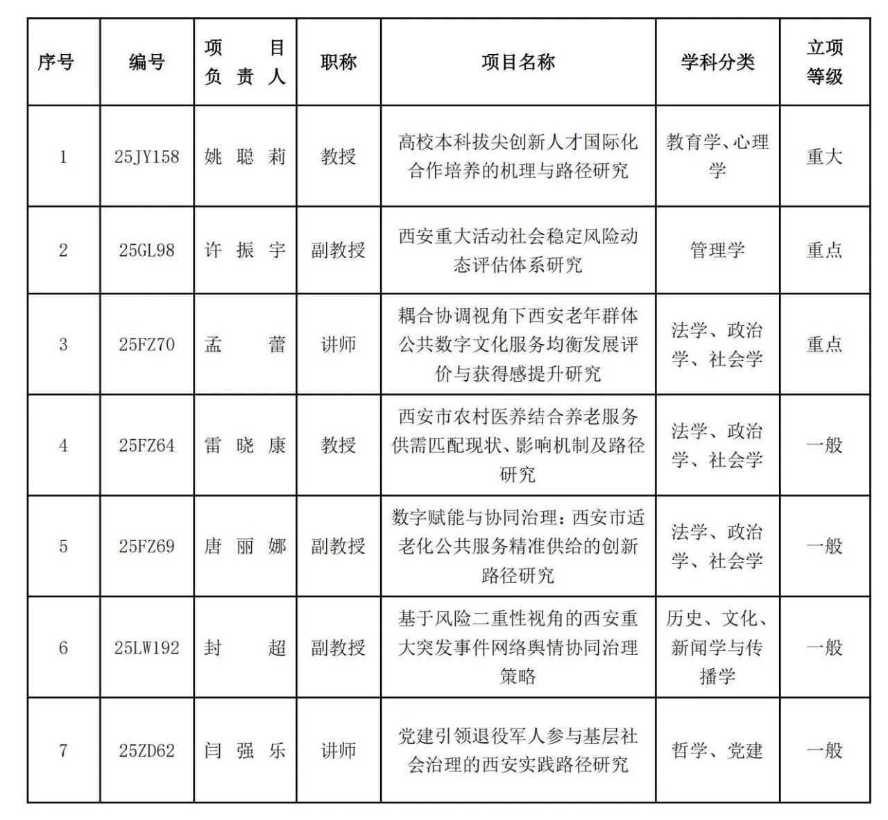 日前,西安市社会科学规划基金管理办公室公示了2025年度西安市社会科学规划基金课题立项名单,我院共有七个项目立项,其中重大项目1项、重点项目2项、一般项目4项。