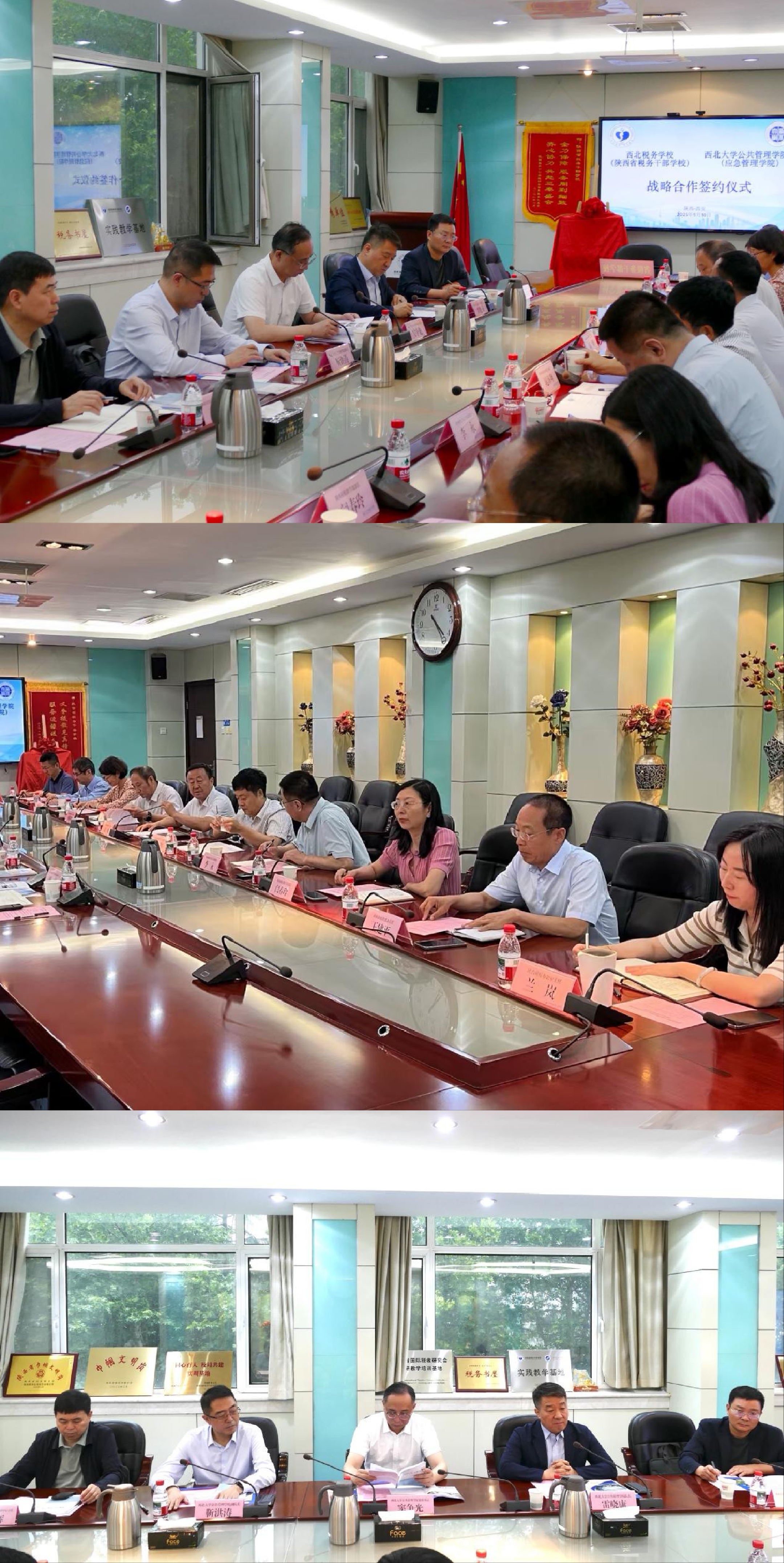 2025年5月30日下午,西北大学565net必赢与陕西省税务干部学校战略合作协议签约仪式在陕西省税务干部学校博学楼隆重举行。我院党委书记窦争光、院长雷晓康、副院长靳洪涛、社会保障系主任吴玉锋、培训中心主任蔡辉,与陕西省税务干部学校党组书记、校长刘峰,党组成员副校长晁海翔、党组成员副校长刘盛贵及各部门负责人共同出席仪式,仪式由陕西省税务干部学校晁海翔副校长主持。