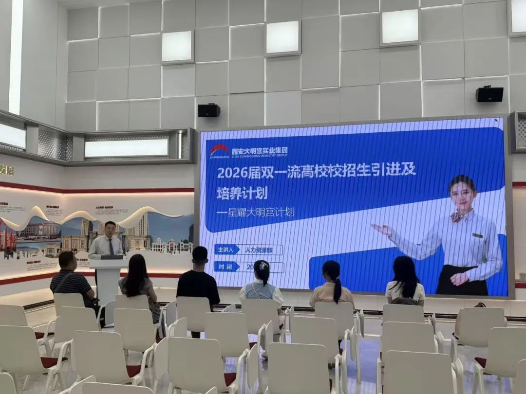 参观结束后,集团人力资源总经理张爱民向来访师生介绍2026年大明宫校招计划——“星耀大明宫”,该计划面向985、211高校本科及研究生,通过“轮岗实践+导师带教+项目历练”模式,从“高学历人才梯队建设”“定制化培养体系”,到“双通道晋升机制”,为学生打造从“职场新人”到“管理骨干”的成长路径。
