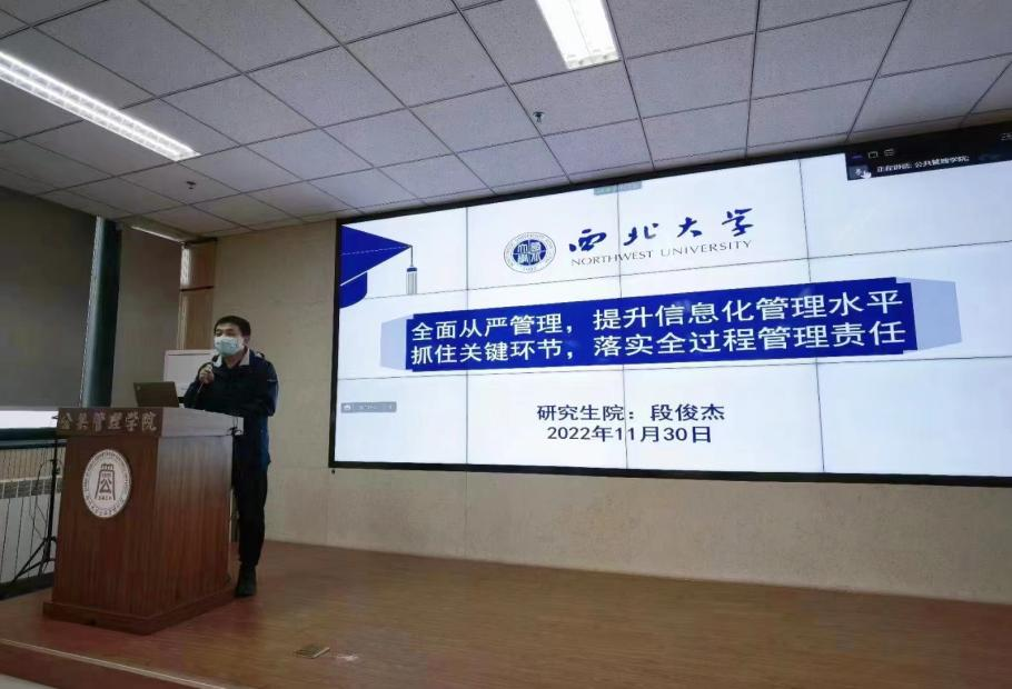 为进一步提升学院研究生对研究生培养及学位管理工作的了解,促进学校与学院研究生教育培养、教学及管理工作的进一步开展,2022年11月30日下午14:00,565net必赢线上组织召开了研究生培养管理辅导会。本次会议邀请到了西北大学研究生院段俊杰老师作为主讲人,565net必赢学院党委书记窦争光、院长雷晓康参加会议,全院70余名研究生参与了此次会议。