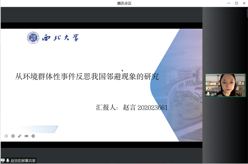 2020级行政管理专业硕士研究生赵言同学的汇报题目为《从环境群体性事件反思我国邻避现象的研究》,研究通过回顾广东茂名反px事件、福建厦门的px事件以及北京六里屯垃圾焚烧发电厂事件等环境群体性事件等,反思了我国目前邻避研究的现状。并基于CSSCI的文献计量和知识图谱分析,借助CiteSpace软件对348篇样本文献的年代分布、研究作者、研究机构、发文期刊、研究焦点以及主题变迁进行可视化分析,勾勒出了近年来邻避研究的发展脉络以及关注主题,从而进一步分析出本领域研究存在的不足之处以及探讨了邻避研究再出发的一些进路。分享内容对于整个邻避研究领域来讲具有一定的理论意义和实践意义。