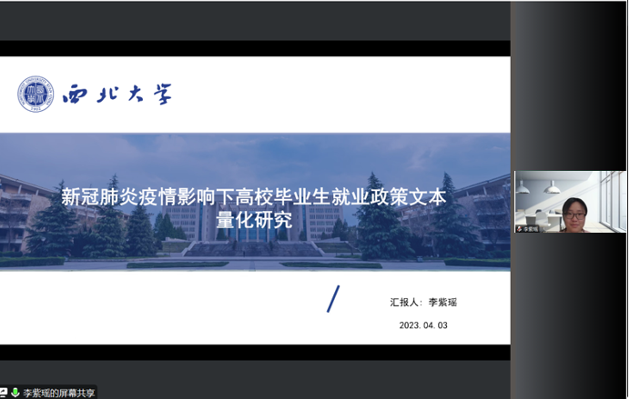 2023年4月3日上午,我院线上举办了2023年第1期研究生专场正学报告会。2020级行政管理专业硕士研究生赵言、张帆帆、李紫瑶、温小雨、杨海玲分别作为主讲人进行专题学术汇报,伍勇副教授担任评议人,部分研究生旁听了此次报告会。