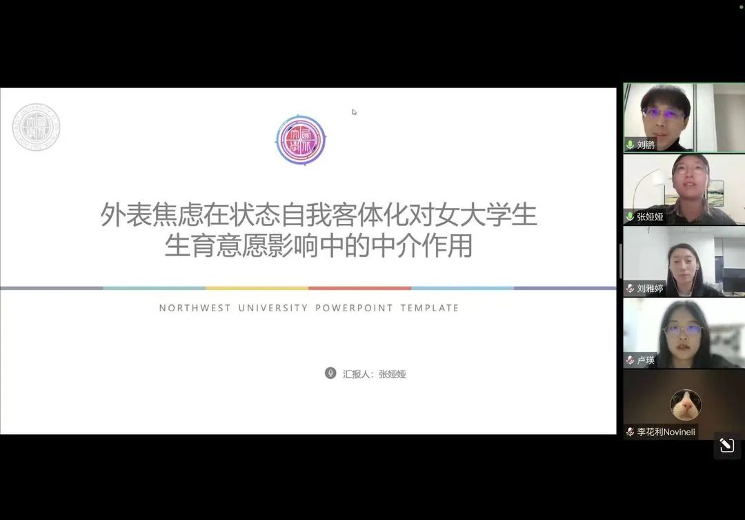 2020级应用心理学专业研究生张娅娅汇报的题目是《外表焦虑在状态自我客体化对女大学生生育意愿影响中的中介作用》,她介绍了生育意愿的影响因素、生育意愿与自我客体化的关系以及外表焦虑的中介作用等内容。