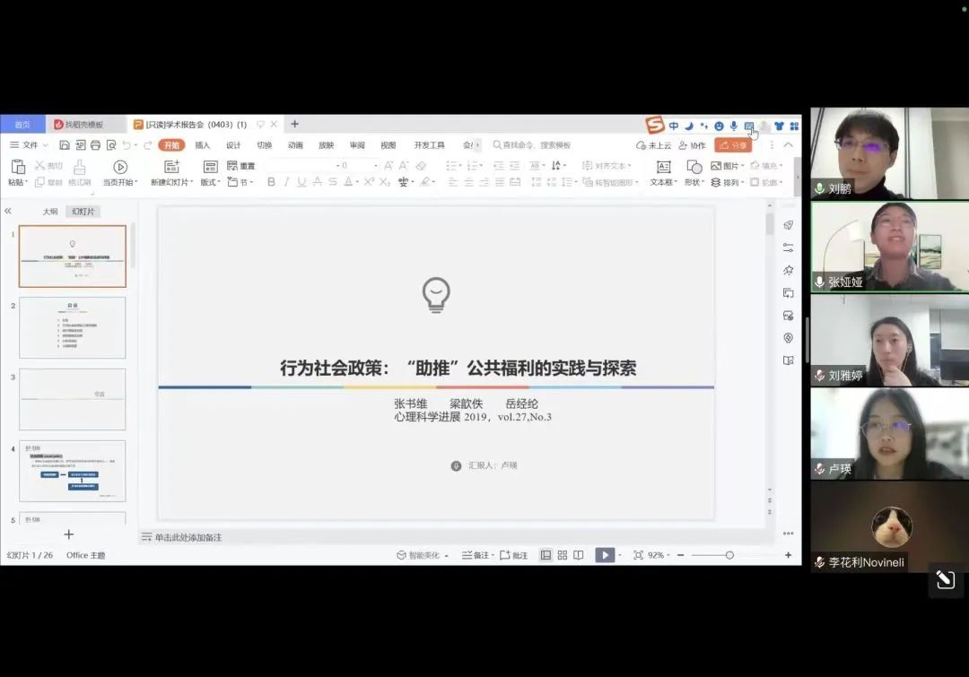 汇报过后,刘鹏副教授认为文章中介绍的三大助推策略——增加策略、减少策略、转换策略各有侧重,相辅相成,对政府政策的推行非常具有启发意义。