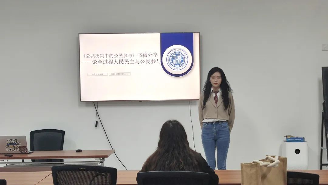 2022级行政管理专业硕士研究生苗美琛分享的书籍为《公共决策中的公民参与》——论全过程人民民主与公民参与,她从公共决策中的公民参与、全过程人民民主、全过程人民民主与公民参与、感悟与总结四个方面展开分享,讲述了托马斯的公民参与有效决策模型,引入了政策质量(决策受到技术、规章和预算约束的程度大小)、政策的公民可接受性(公民的态度和配合程度)两个变量。同时指出:作者在本书中提出了一个新的视角,即公民参与的可操作性理论。