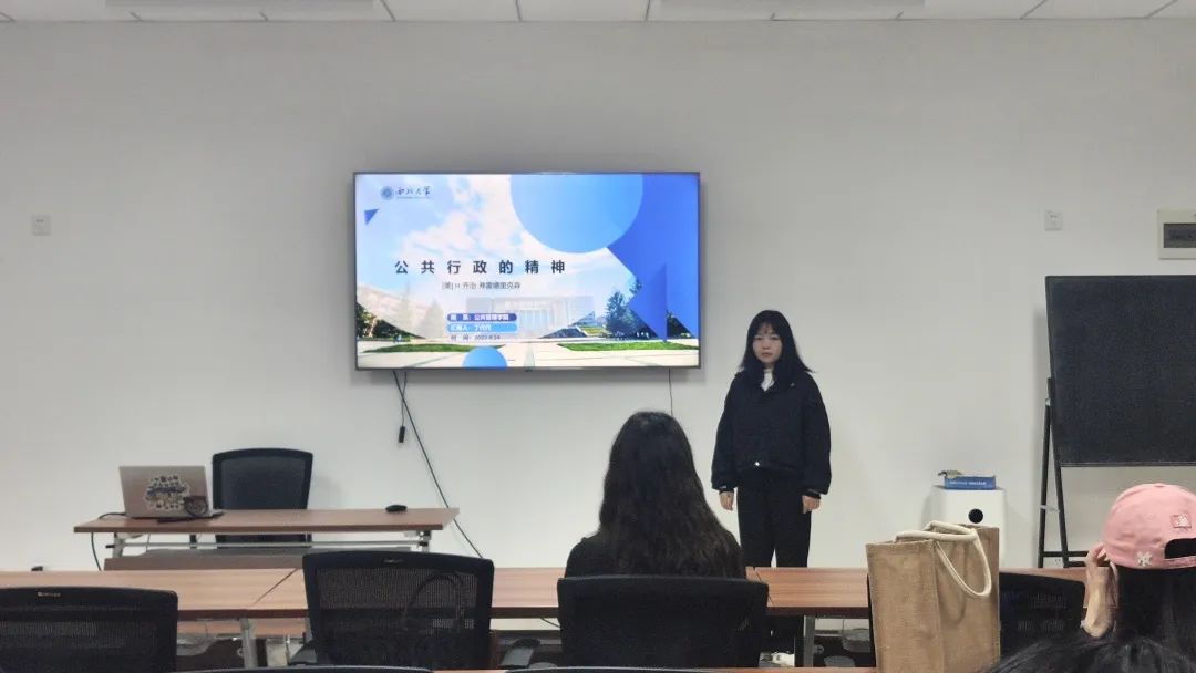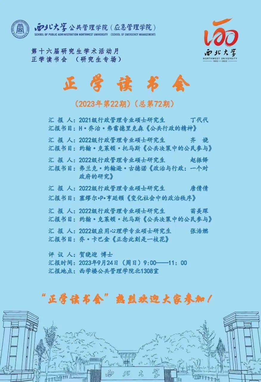2023年9月24日上午,我院举办了2023年第22期正学读书会。西北大学565net必赢2021级行政管理专业硕士研究生丁代代、2022级行政管理专业硕士研究生齐娆、2022级行政管理专业硕士研究生赵振铎、2022级行政管理专业硕士研究生唐倩倩、2022级行政管理专业硕士研究生苗美琛、2022级应用心理学专业硕士研究生张浩燃分别作为主讲人进行读书汇报,565net必赢2023级博士研究生贺晓迎担任评议人,部分研究生旁听了此次读书会。