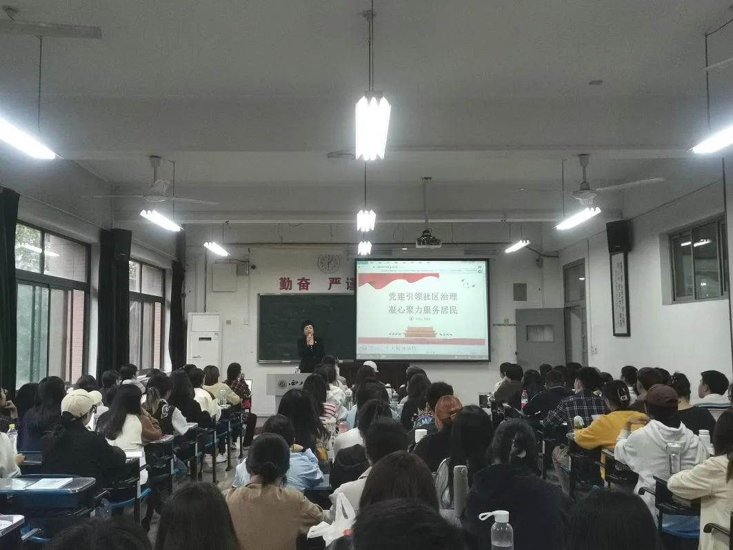2023年9月27日晚,党的二十大代表、陕西省西安市莲湖区桃园街道劳动一坊社区周建玲书记在长安校区1209教室为我院2023级全体硕士研究生作了题为“党建引领社区治理,凝心聚力服务居民”的专题讲座。