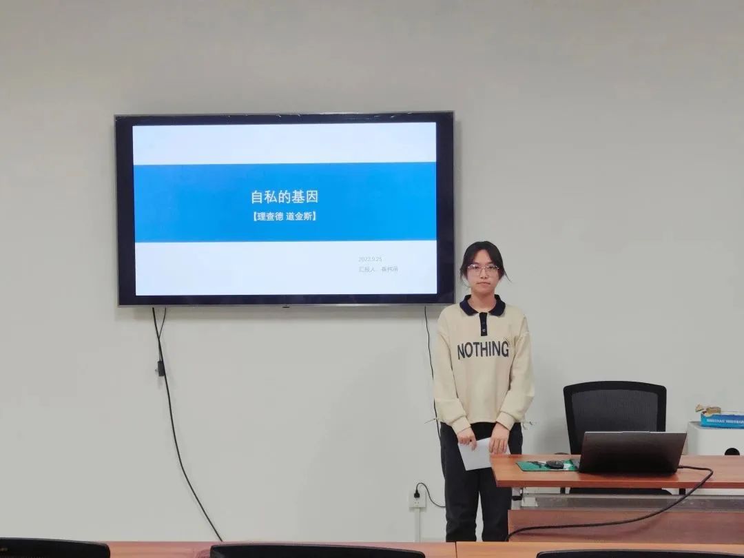 2022级应用心理学专业硕士研究生崔祎萌分享的书籍是理查德.道金斯的《自私的基因》,她从作者写作背景,主要论点,内容简介以及感想与感悟五个部分对本书进行了详细的汇报。她提到,文中通过迷因理论对人类和动物都具有的生物演化和人类社会特有的文化传播进行解释。生物繁衍的单位是基因,而文化传播的单位是觅母,这两种单位不同又相似,根本目的都是为了增加自身的复制体,基于这一根本目的,动物乃至人类衍生出许多的物种繁衍活动以及文化的兴起衰落。紧接着,她强调本书揭示世界真相的目的并不是为了使得人们遵从“物竞天择,适者生存”的利己主义生存策略,反而在认清世界真相的情况下更要发挥人们的主观能动性。