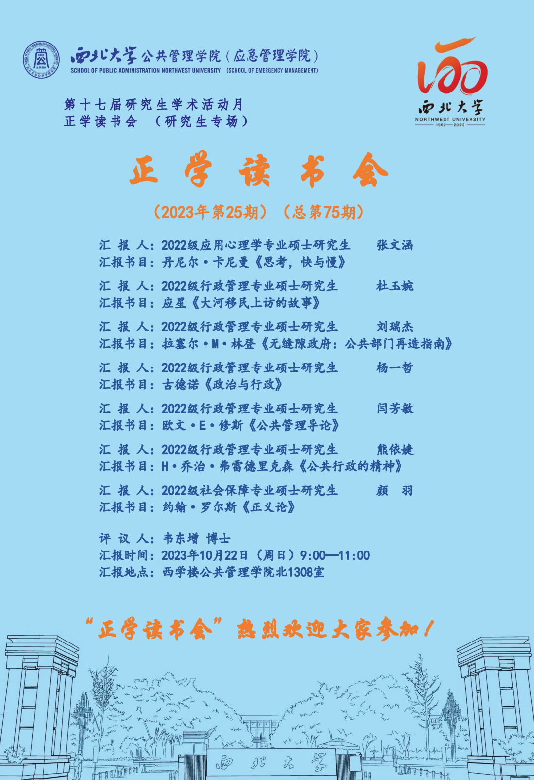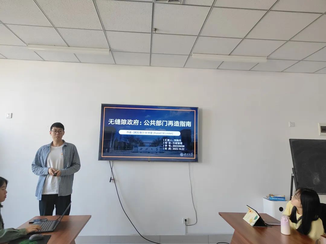 2023年10月22日上午,我院在西学楼北1308室举办了2023年第25期正学读书会。2022级应用心理学专业硕士研究生张文涵、2022级行政管理专业硕士研究生杜玉婉、2022级行政管理专业硕士研究生刘瑞杰、2022级行政管理专业硕士研究生杨一哲、2022级行政管理专业硕士研究生闫芳敏、2022级行政管理专业硕士研究生熊依婕、2022级社会保障专业硕士研究生颜羽分别作为主讲人进行读书汇报,565net必赢2023级博士研究生韦东增担任评议人,部分研究生旁听了此次报告。