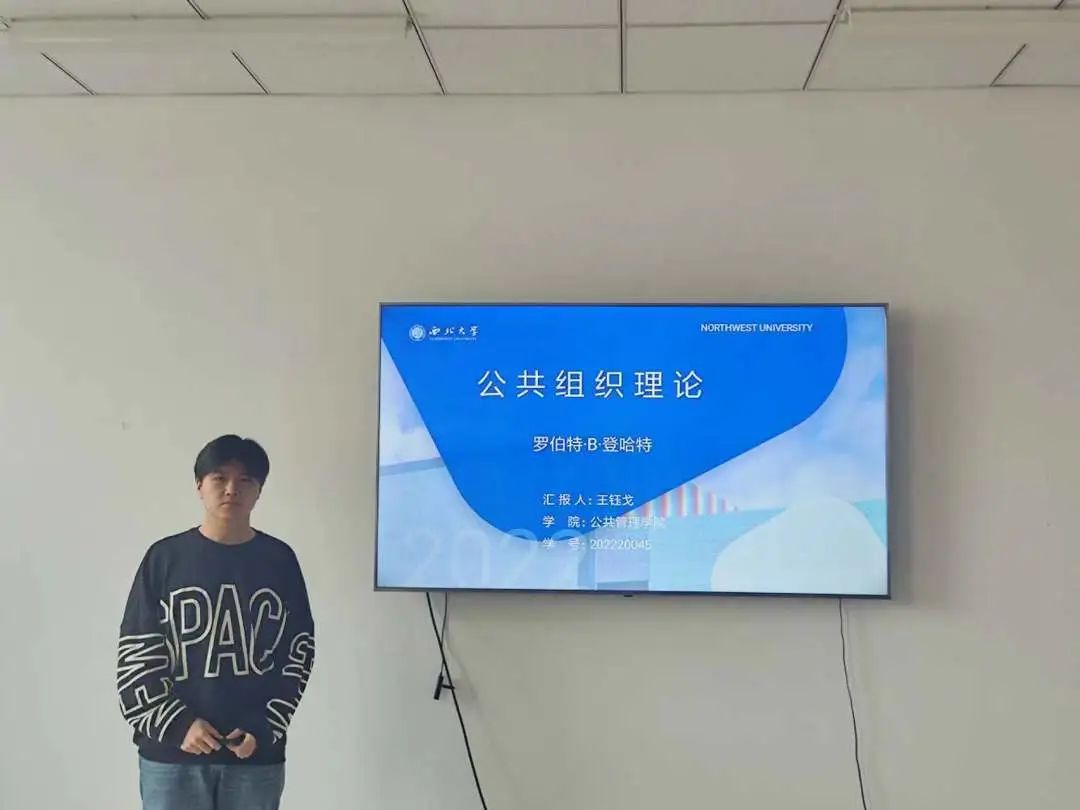 2022级行政管理专业硕士研究生王钰戈分享了罗伯特·登哈特的《公共组织理论》,他从作者简介、写作背景、主要内容、感悟体会四个部分进行分享。他首先介绍了公共组织的定义与内涵,进而对公共组织思想和理论的发展进行了梳理。紧接着,他向大家简要介绍了最新公共行政与公共管理学科的流派发展。最后,他分析了对“公共组织”研究的理论意义与现实意义,并提出了自己的观点。