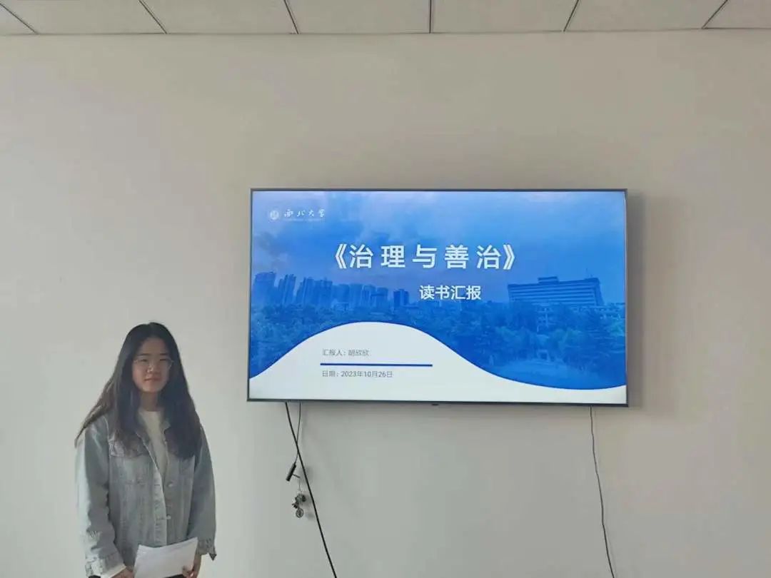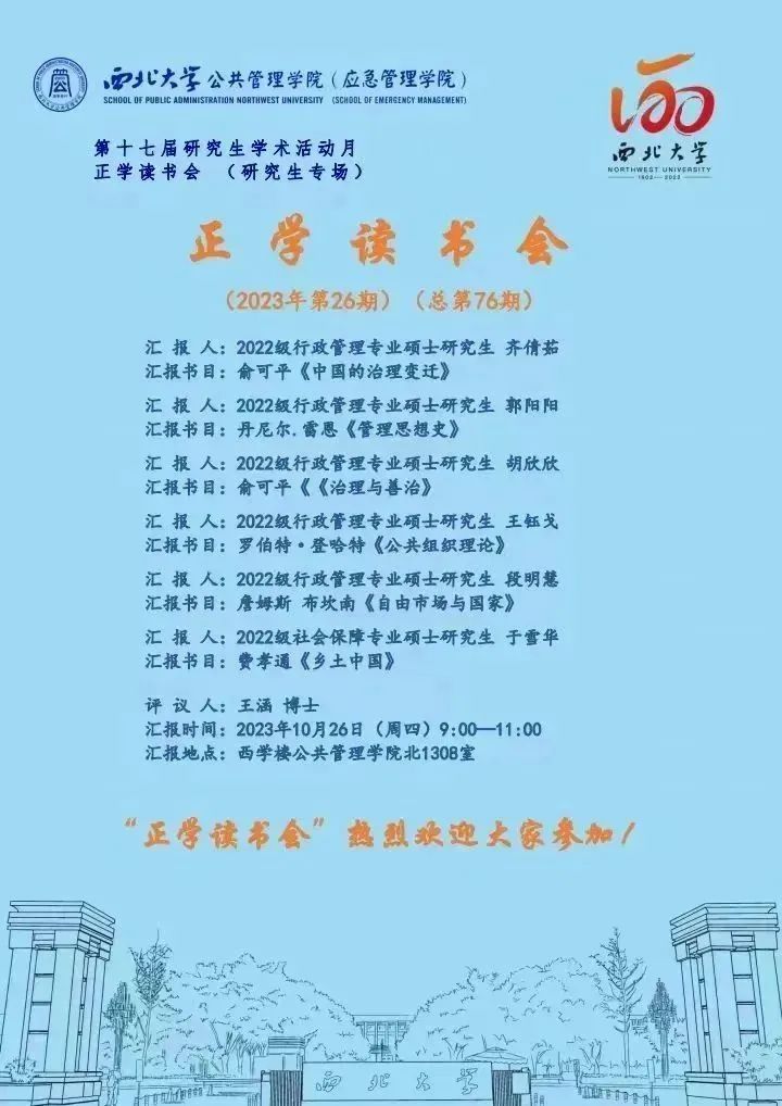 2023年10月26日上午,我院在西学楼北1308室举办了2023年第26期正学读书会。2022级行政管理专业硕士研究生齐倩茹、2022级行政管理专业硕士研究生郭阳阳、2022级行政管理专业硕士研究生胡欣欣、2022级行政管理专业硕士研究生王钰戈、2022级行政管理专业硕士研究生段明慧、2022级社会保障专业硕士研究生于雪华分别作为主讲人进行读书汇报,565net必赢2023级博士研究生王涵担任评议人,部分研究生旁听了此次报告会。