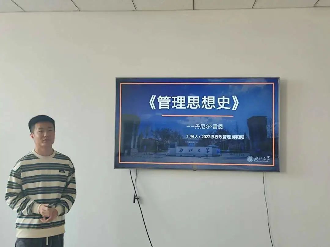 2022级行政管理专业硕士研究生郭阳阳分享的书目是丹尼尔·雷恩的《管理思想史》,他围绕作者与作品简介、关键词与内容简介、案例分享以及总结四个方面进行展开,主要介绍了《管理思想史》的主体内容。首先,他通过阐述经典的管理思想史和管理问题引出了本书的核心观点。紧接着,他以科学管理的“理性人”和霍桑实验的“社会人”为例,提出了新古典组织理论的发展倾向。最后,他对本书内容进行了简要总结并提出了自己的思考,反思了自己在阅读过程中存在的问题。