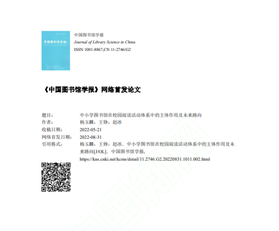 我院杨玉麟教授、王铮副教授及其团队合作的论文《中小学图书馆在校园阅读活动体系中的主体作用及未来路向》一文在顶级期刊《中国图书馆学报》2022年8月31日网络首发。