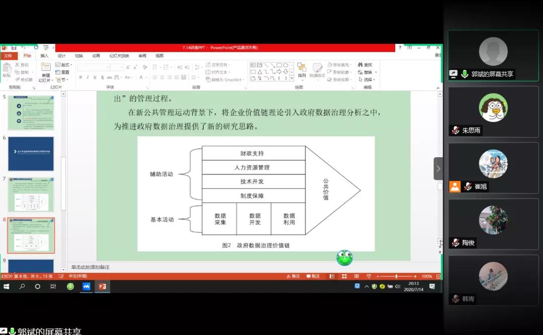 郭斌老师分享了他的研究成果《基于价值链的政府数据治理:模型构建与实现路径》。随着数字时代的到来,政府数据治理已成为推进政府治理变革和治理绩效提升的重要举措。研究以政府数据治理内涵分析为基础,以政府数据的公共价值创生为核心,借鉴企业价值链分析框架,构建政府数据治理的价值链模型,并从树立公共价值驱动的政府数据治理理念、优化政府数据治理流程、完善政府数据治理保障条件等方面提出政府数据治理实现的路径,推进了政府数据治理研究的深化。