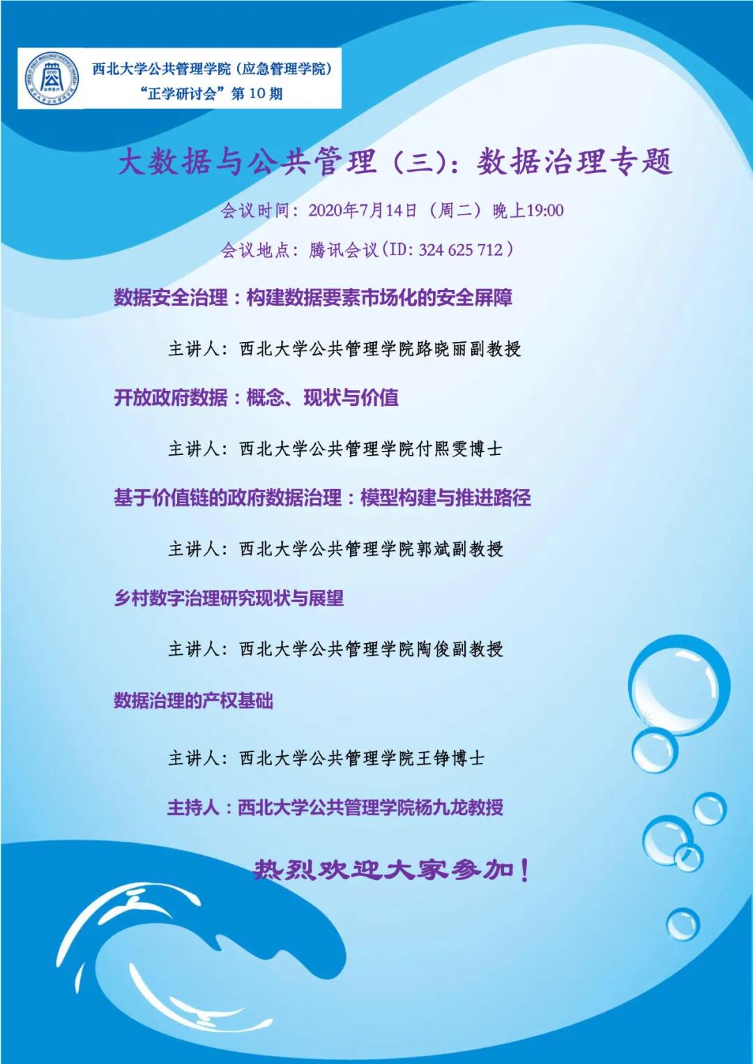2020年7月14日晚19点,565net必赢客户端举办了第十期“正学研讨会”——“大数据与公共管理(三):数据治理专题”。本次研讨会有5个报告,报告人分别是路晓丽老师、付熙雯老师、郭斌老师、陶俊老师、王铮老师。杨九龙老师主持了本次会议。在会议伊始,杨九龙老师向参会者介绍了本期研讨会主题设置的背景和目的,希望通过报告人多角度分享研究心得和研究成果,促进大家对大数据与公共管理问题的进一步关注。有160余位师生参加了这次研讨会。