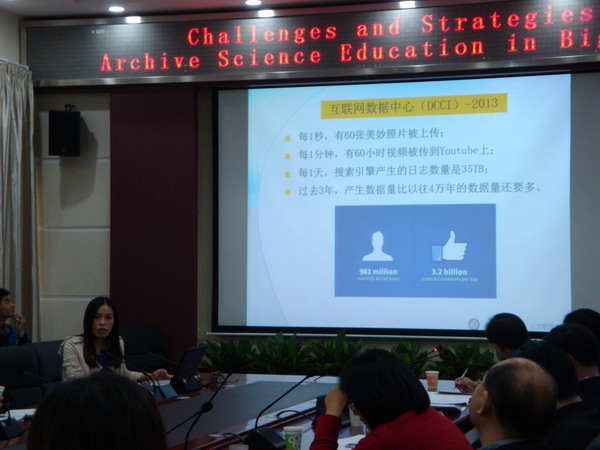 在本次会上,李姗姗博士做了题为《大数据时代档案学教育的理念变革与内容拓展》专题学术报告,报告在分析大数据时代背景及大数据基本特征的基础上,阐述了以下观点:(1)教育资源由“分散独立”走向“优势融合”;(2)课程建设由“面向业务”转向“面向价值”;(3)对教育内容进行系统化拓展;(4)知识模块由“横向切割”转为“纵向切割”;(5)教育模式由“面向群体”转为“面向个体”;(6)教学管理由“单维信息”转为“多维信息”。