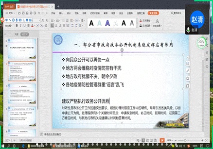 undefined赵清副教授从“新冠肺炎疫情防控中的政务公开问题和建议”主题进行了分享。他围绕以下五个方面提出了问题及建议:政务公开流程;政务组织改革;地方政府间部门间沟通、反馈、问责机制;政务公开信息审核和发布;卫健委、疾控中心等内控以及地方政府协调机制。