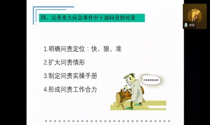 undefined李莉老师主要分析了“新冠肺炎的干部问责:特点与不足”。她从疫情防控中加强干部问责的重要性、新冠肺炎防控中干部问责的特点、新冠肺炎防控中干部问责存在的不足、完善重大应急事件中干部问责的对策四个方面进行了分享。