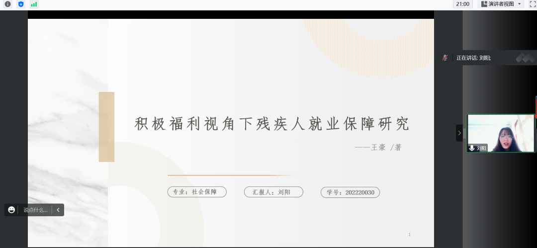 2022级社会保障专业硕士研究生刘阳分享了王豪的《积极福利视角下残疾人就业保障研究》。其汇报主要从写作背景、理论基础、逻辑框架、核心内容与读书感悟五个部分展开论述,她首先展示了我国残疾人和残疾人就业的数据,着重介绍了积极福利理论的内涵。进而她阐释了积极福利思想在残疾人就业方面的应用。最后她分析了对“残疾人就业”话题研究的理论意义与现实意义,并提出了自己的建议。
