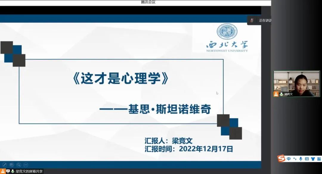 2022级应用心理学专业硕士研究生梁竞文分享了加拿大心理学家基思·斯坦诺维奇的《这才是心理学》,汇报主要从作者简介、写作背景、基本框架和核心内容、感悟与启发四个方面进行讲述。首先,她简要介绍了本书的作者和写作背景。接着,她以“什么是心理学”、“什么是科学”两个问题为核心,对本书的主要内容进行介绍,她阐述了定义科学的三个特征,同时强调了概率思维在心理研究中的重要性,进而提到心理学研究中个案和见证叙述在科学研究中的作用以及如何避免鲜活性问题对研究结果的影响,最后强调了“关联性原则”和“聚合性证据原则”在科学进步中的重要性。在汇报的最后,她分享了个人的读书感悟与启发。