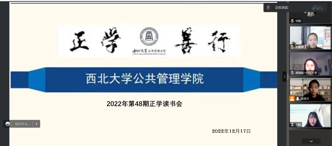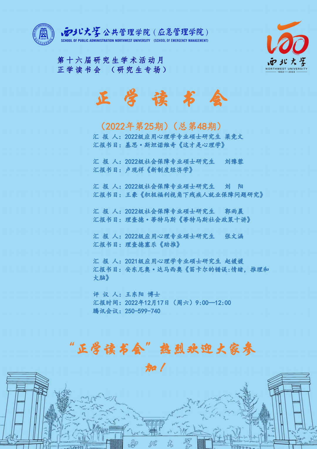 2022年12月17日上午,我院线上举办了2022年第25期正学读书会。2022级应用心理学专业硕士研究生梁竞文、2022级社会保障专业硕士研究生刘豫蓉、2022级社会保障专业硕士研究生刘阳、2022级社会保障专业硕士研究生郭雨晨、2022级应用心理学专业硕士研究生张文涵、2021级应用心理学专业硕士研究生赵媛媛分别作为主讲人进行读书汇报,565net必赢2022级公共管理博士研究生王东阳担任评议人,部分研究生旁听了此次报告会。