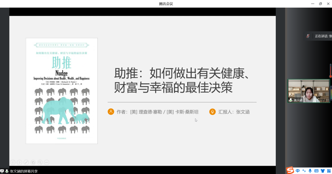 王东阳博士对汇报内容作出了点评,他肯定了张文涵同学汇报的逻辑清晰性。同时,王东阳博士提出了自己对本书的见解,他认为本书中最重要的是如何应用助推使选择体系的任何一方面,都不采用强制的方式,以一种预言方式去改变人们的选择或者改变他们的经济动机及行为。同时,我们作为选择设计者(个人或政府),如何巧妙地设置选项或改变环境让人们做出更好的选择也很重要。