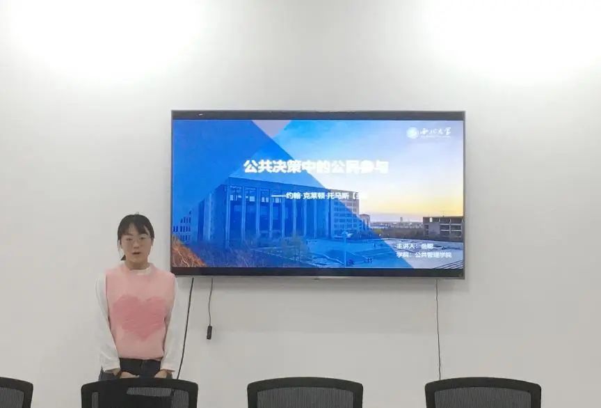2021级行政管理专业硕士研究生岳聪同学汇报了约翰·克莱顿·托马斯的著作《公共决策中的公民参与》,其汇报从作者学术经历、公民参与问题的缘起、公民参与问题的有效模型、我国发展公民参与的启示四方面展开,她着重强调了本书的重点和核心部分“公民参与的有效决策模型”并阐述了公民参与的实施途径,对我国的公民参与实践具有重要借鉴意义。