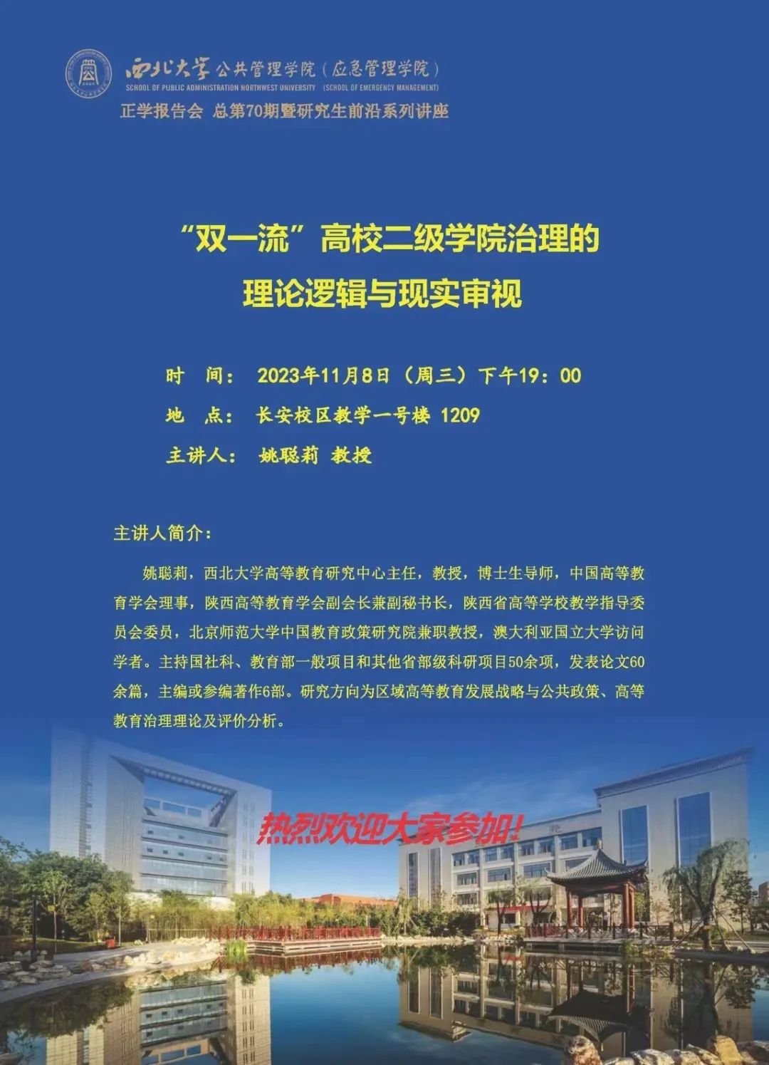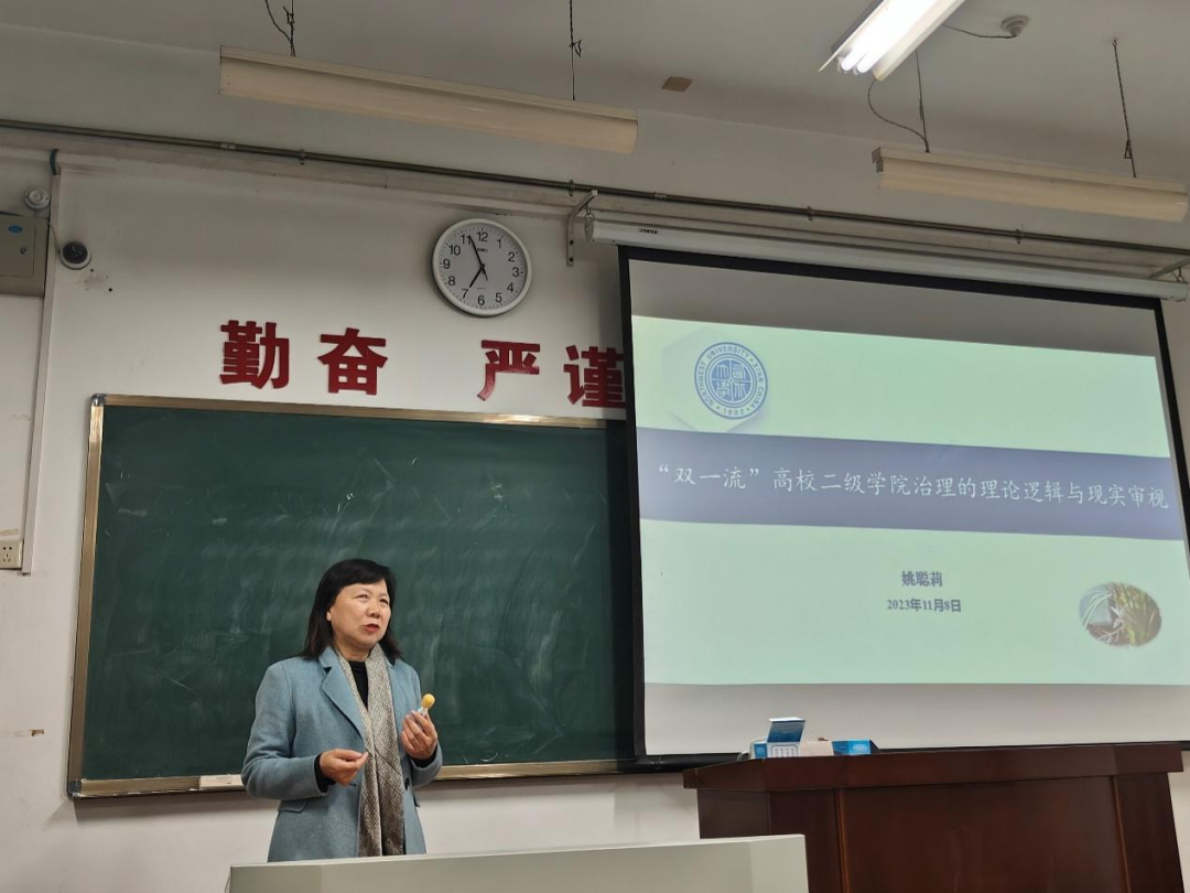 2023年11月8日晚,西北大学565net必赢姚聪莉教授在长安校区教学一号楼1209教室为我院2023级全体硕士研究生作了题为“‘双一流’高校二级学院治理的理论逻辑与现实审视”的专题讲座。