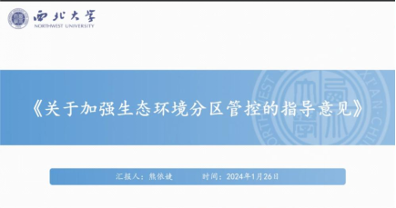 随后,熊依婕同学以《关于加强生态环境分区管控的指导意见》为分享文件,从文件的出台背景与意义谈起,分享加强生态环境分区管控的必要性与重要性,以新时代中国特色社会主义生态文明思想指导生态环境保护,接着从制度、管理、应用、基础四个角度详细介绍了文件的主要内容,探索加强生态环境分区管控的治理模式和政策路径,最后以专家对这一重点的解析持续深化对加强生态环境分区管控的认识,有助于我们更深度地理解生态环境分区管控的作用。