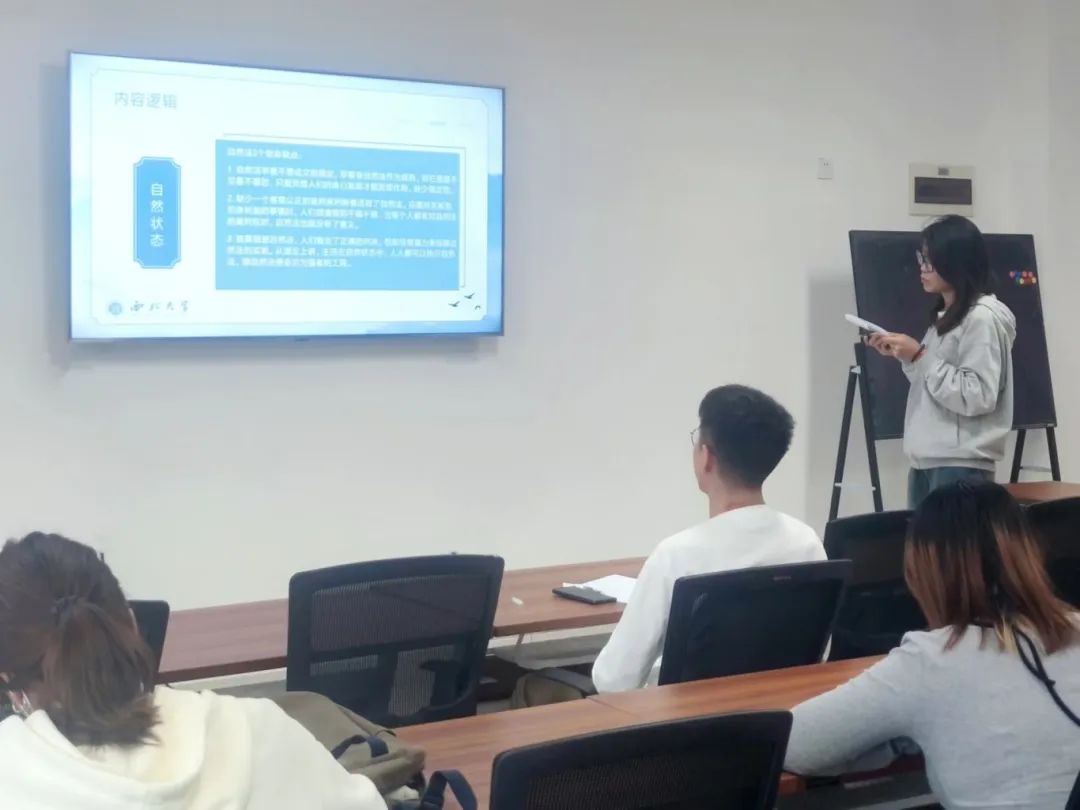 2023级行政管理专业硕士研究生王佳坤分享的书籍是卢梭的《社会契约论》。她从作者生平、内容概述、观点比较、理论影响四个部分进行汇报。卢梭自幼便喜好读书,但生活艰苦,曾混迹上流社会,为贵族工作。这些经历使他具有西方古典自由民主思想,且懂得民生疾苦,了解封建制度的腐败,也为他形成主权在民的思想奠定基础。本书中,他试图找到一个能把法律置于一切人之上的政府形式。他认为,在自然状态下,威胁人的生存障碍远超人维持生存的能力范围,因此人们签订社会契约,建立政治共同体。在社会契约这一概念的建构上,霍布斯的理论去道德化与神圣化,并提出“授权无悔”原则;而卢梭与洛克则认为政治具有道德价值,社会契约由全体成员签订,那么全体成员也有权收回。《社会契约论》对西方资本主义革命产生了深远影响。本书不仅在点燃革命烈火方面起到了极其重要的作用,也对政治哲学有深远影响,卢梭的政治观点为西方建立民主政治提供了思路,对政府建立的假设也成为政治哲学的重要理论。