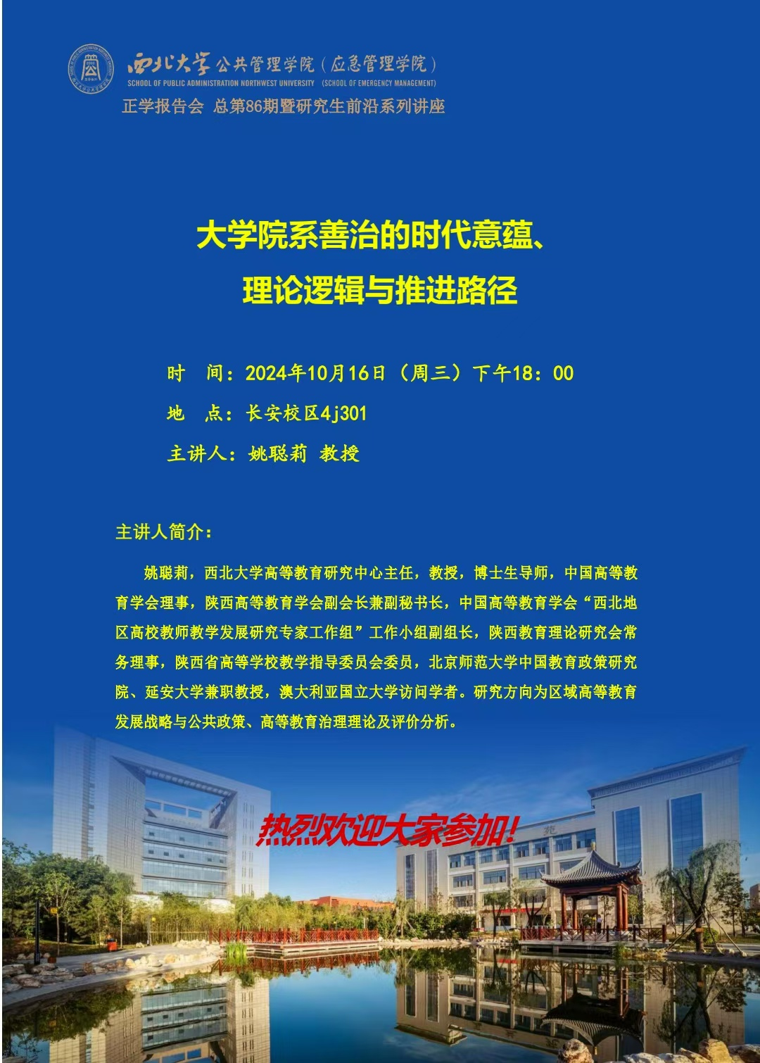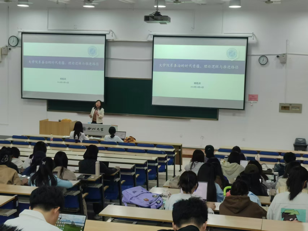 2024年10月16日晚19:00,西北大学565net必赢姚聪莉教授在4J301教室为我院2024级全体硕士研究生作了题为“大学院系善治的时代意蕴、理论逻辑与推进路径”的专题讲座。