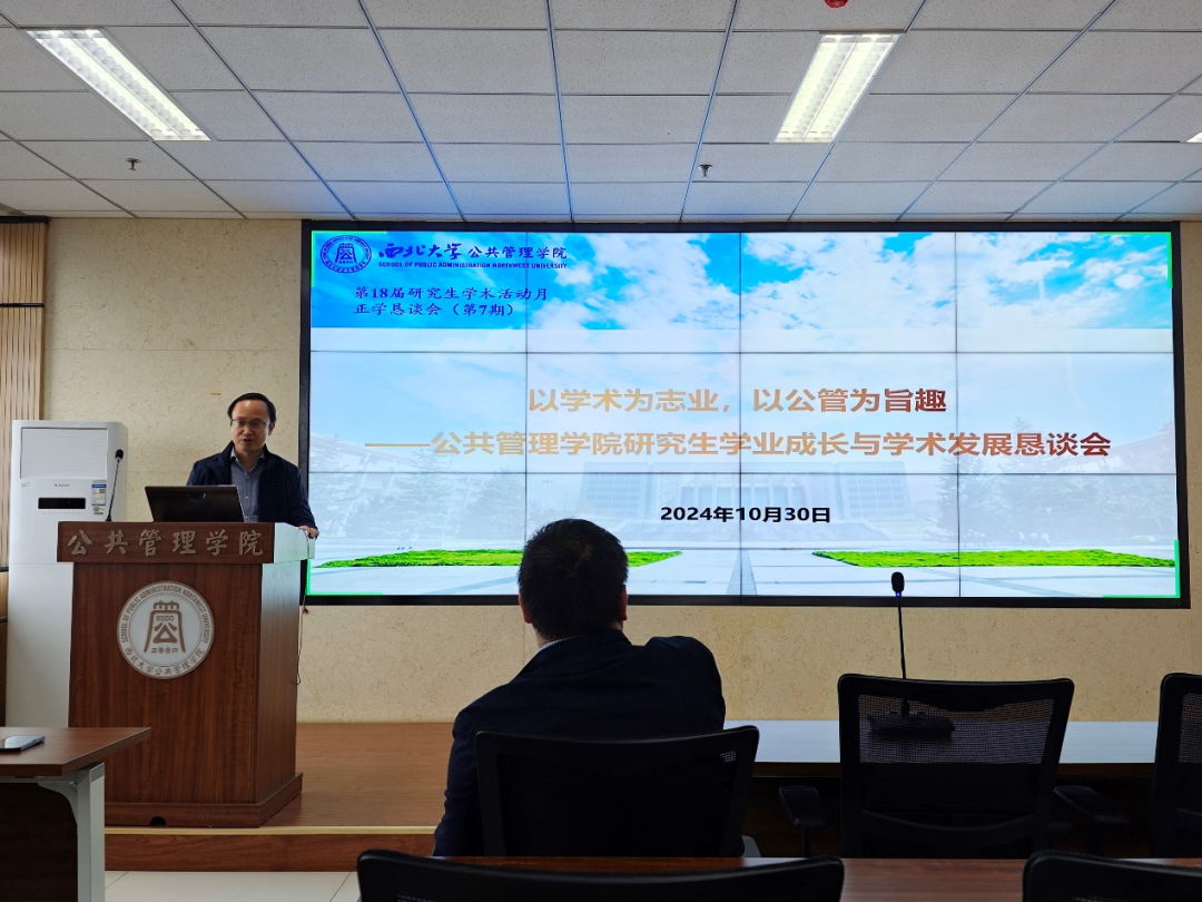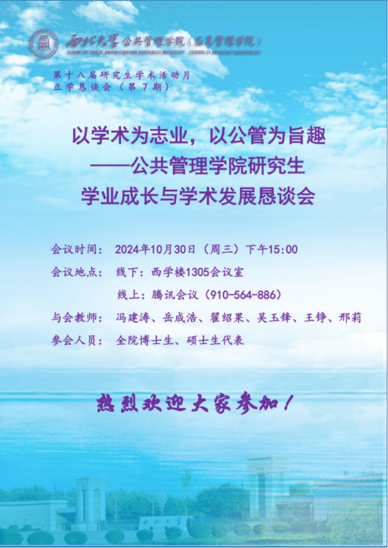 为进一步提升我院研究生管理效率与教学质量,多方面了解、回应研究生诉求,加强学校、学院同学生间的交流互信,建立思想、意见、问题沟通渠道。2024年10月30日,565net必赢在西学楼1305会议室召开主题为“以学术为志业,以公管为旨趣”的正学恳谈会(研究生专场),本次会议采用“线上+线下”方式同步进行。校研究生院副院长冯建涛、我院科研副院长翟绍果、外事副院长岳成浩、社会保障学系主任吴玉锋、公共信息资源管理系主任王铮、研究生秘书邢莉以及全院硕博研究生代表参与本次会议,会议由翟绍果教授主持。