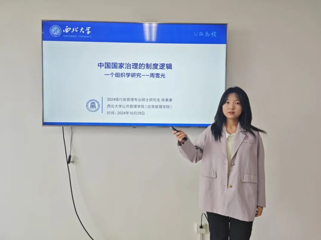2024级行政管理专业硕士研究生陈素素分享的书籍是周雪光教授的《中国国家治理的制度逻辑:一个组织学研究》,她从作者简介、写作背景、章节介绍、反思与思考四个部分展开。首先,她简要介绍了作者周雪光的基本信息、学术贡献、职业经历和研究重心转变。其次,她介绍了这本书的写作背景,作者从组织学研究角度来认识中国国家治理的制度逻辑,特别着眼于中国官僚体制的形态、特点和意义。接着,她阐述了本书的三个部分,第一部分“国家治理逻辑的制度分析”中的三章,进一步阐述和延伸导论中提出的国家治理的制度设施及其三个应对机制。第二部分“国家治理逻辑与政府行为”以基层政府治理过程和组织行为为着眼点,讨论解读国家治理制度逻辑在基层社会运行的微观过程和机制。第三部分“国家治理逻辑与中国社会”转向国家治理的第二条主线,即国家与民众关系,将国家治理放在国家与社会互动的大背景下讨论。最后,她对“运动型治理机制”“灵活变通”这两个点进行反思与总结。